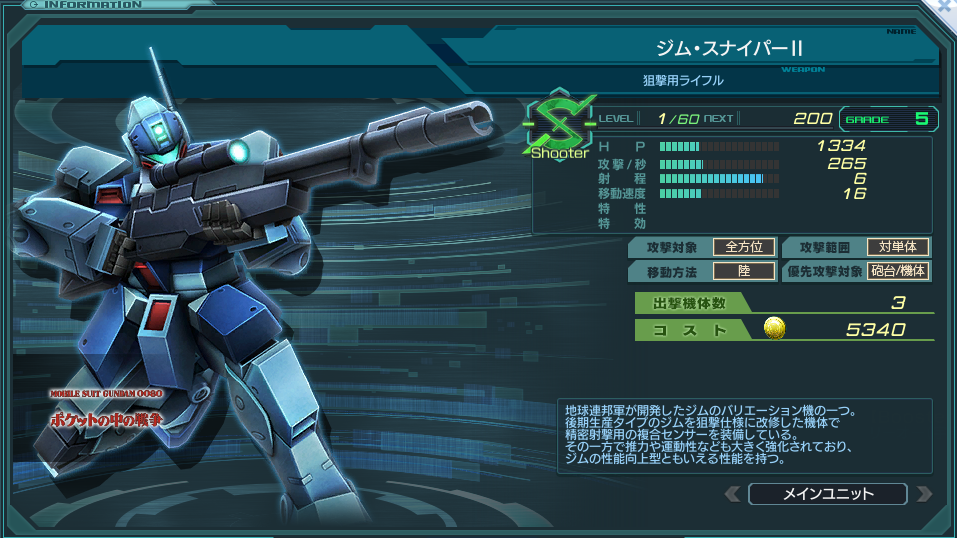 砲台/機体優先の射程6のS型量産機。ジム・スナイパーと同様に機体数は少ない。