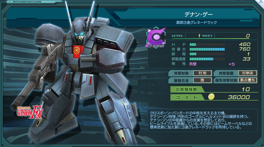 現状最後のクラッシャータイプ。 初期機体数もハイザック並に多く、単純火力も全量産機中最大を誇る。移動速度もB型を除いて最速なので後発からの拠点破壊を容易にしている。 良いとこづくしだが、ツリーの都合85or100枚と多大なレアチップを要求されるのが最大のネックとなるであろう。