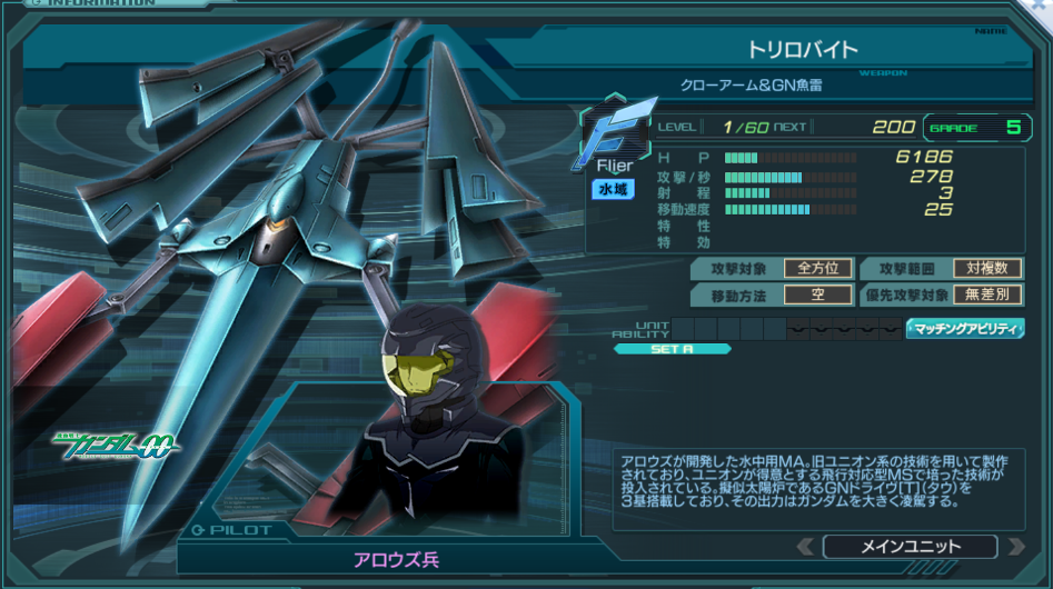 一覧 量産機 | エース | MA 最終ステータス 量産機 | エース | MA 比較データ エースGバースト | シリーズ別早見表 | 特性早見表| MS索引 赤字はレベルアップによるMAX値 基本ステータス