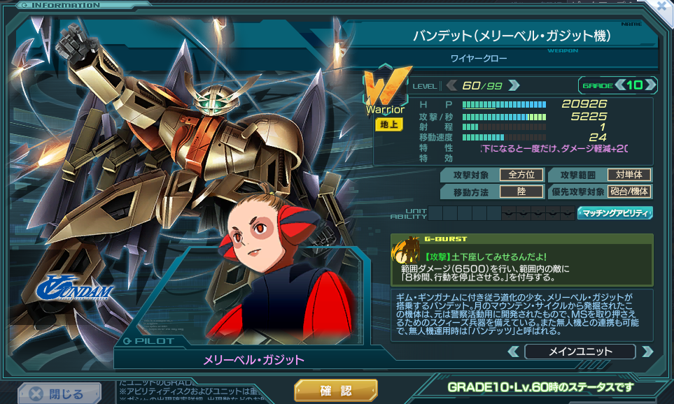 一覧 量産機 | エース | MA 最終ステータス 量産機 | エース | MA 比較データ エースGバースト | シリーズ別早見表 | 特性早見表| MS索引 赤字はレベルアップによるMAX値 基本ステータス
