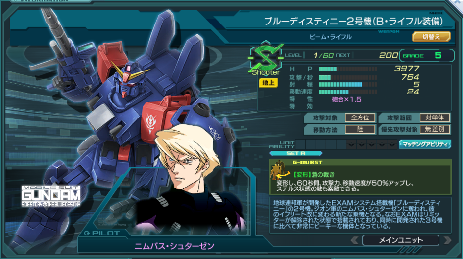 一覧 量産機 | エース | MA 最終ステータス 量産機 | エース | MA 比較データ エースGバースト | シリーズ別早見表 | 特性早見表| MS索引 赤字はレベルアップによるMAX値 基本ステータス