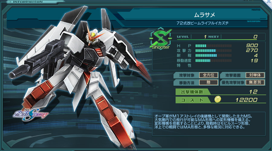 現状最後に製作できるシュータータイプで、ザクⅢの上位互換。 初期機体数は同じだが、移動速度がS型最速の19。 それ以外のことはもう語ることがない。