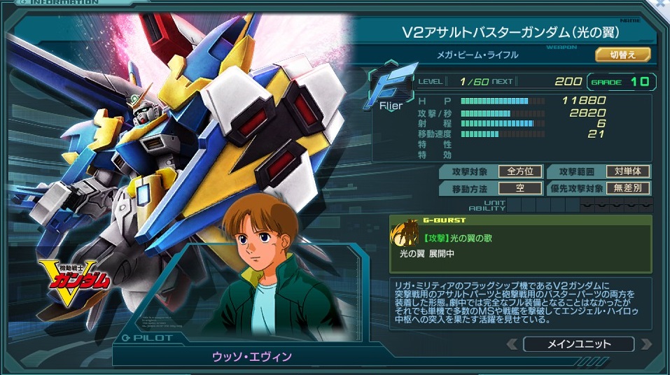 一覧 量産機 | エース | MA 最終ステータス 量産機 | エース | MA 比較データ エースGバースト | シリーズ別早見表 | 特性早見表| MS索引 赤字はレベルアップによるMAX値 基本ステータス