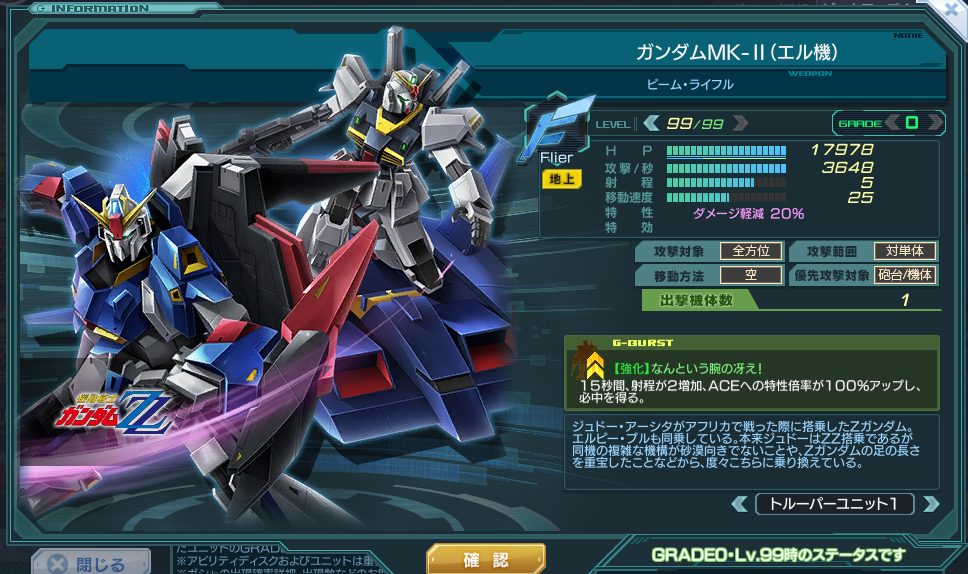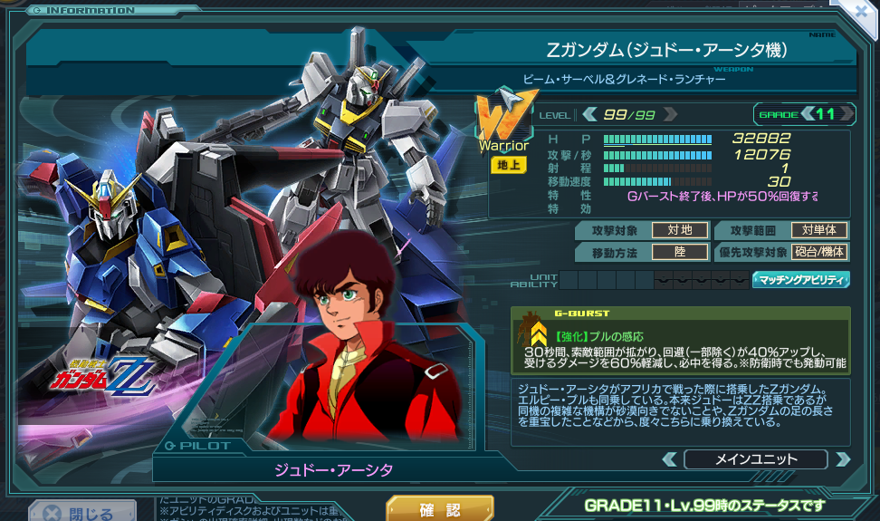 一覧 量産機 | エース | MA 最終ステータス 量産機 | エース | MA 比較データ エースGバースト | シリーズ別早見表 | 特性早見表| MS索引 赤字はレベルアップによるMAX値 基本ステータス