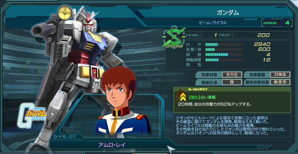 一覧 量産機 | エース | MA 最終ステータス 量産機 | エース | MA 比較データ エースGバースト | シリーズ別早見表 | 特性早見表| MS索引 赤字はレベルアップによるMAX値