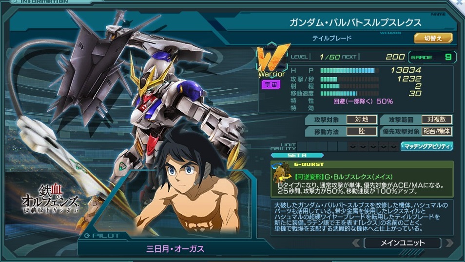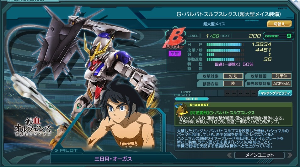 | Booster | 特性 | 回避(一部除く) 50%、ダメージ軽減 30% 出撃後、味方ユニットが撃破される度、攻撃速度+1% エース・MA×1.5 | ||