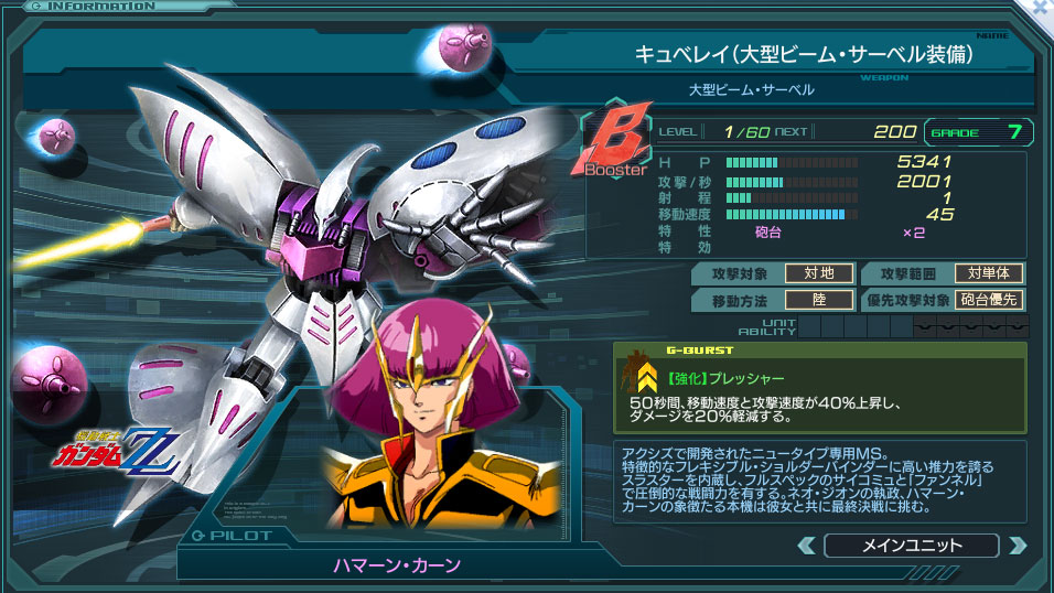 キュベレイのB型版。シリーズが「機動戦士Zガンダム」ではなく「機動戦士ガンダムZZ」になっているので特効の確認ミスに注意。