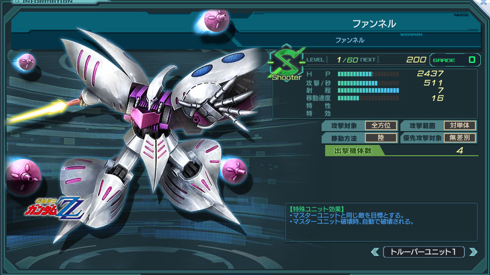 トルーパーの常時追随ファンネルが盾になってくれるため、単純な合計HPなら23,385(G10、Lv60時)とW型並のタフネスを誇る。