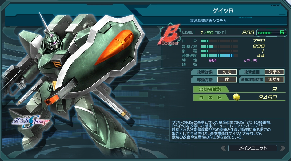 量産Bでは初の無差別、生産と砲台の両方に2.5倍ボーナス機体(エースを含むならゲルググ・M(シーマ機)に次ぐ)。