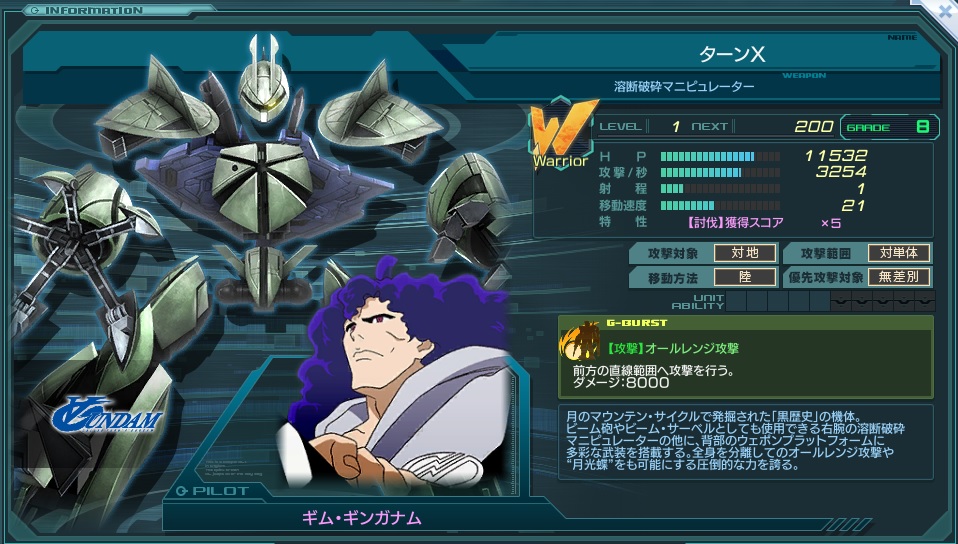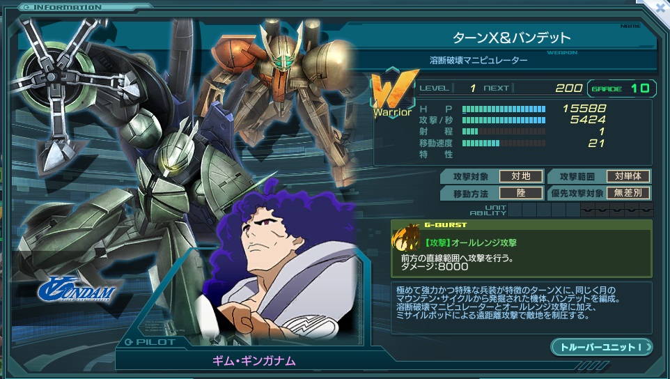 カタログスペック上はスタンダードな範囲攻撃Gバースト持ちW型エースであるが、 2秒の攻撃間隔、奥行きが浅く左右幅の広いGバースト攻撃範囲、そしてGバーストのモーションの長さは驚きの8秒と 表向きの数値に現れない部分に独特のクセを持つ。 特にGバースト周りは特徴的で、前方射程の短さとダメージ発生の遅さから空振りが起きやすい反面、 最前列で発動できれば横幅の広さをフルに生かしやすいだけでなく、長いモーション中の無敵時間を利用して量産機の盾にもなれる。 艦隊長でありながら自ら先陣を切るギム・ギンガナムらしく、最前列に立って戦線を切り開く運用に向いたエースと言える。 2016年3月8日のアップデートにおいて、武装名が『溶断破砕マニピュレーター』から『溶断破壊マニピュレーター』に修正された。 昔から前者の名前で各種ゲームなどにも登場しているため、馴染みが無い人も多いが、現在のターンエー公式サイトにある MS紹介ページ(http://www.turn-a-gundam.net/mobilesuit/26.html)には後者の名前で掲載はされており、それに合わせたと考えられる。