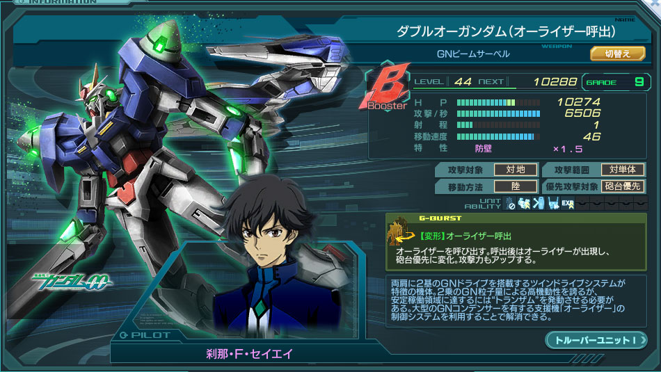 ![]() | 名称 | ダブルオーガンダム(オーライザー呼出) | ||