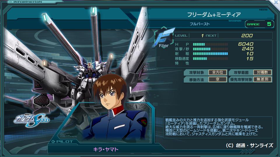 フリーダムガンダムにミーティア(M.E.T.E.O.R (Mobilesuit Embedded Tactical EnfORcer=モビルスーツ埋め込み式戦術強襲機))を合体させたのが本機である。