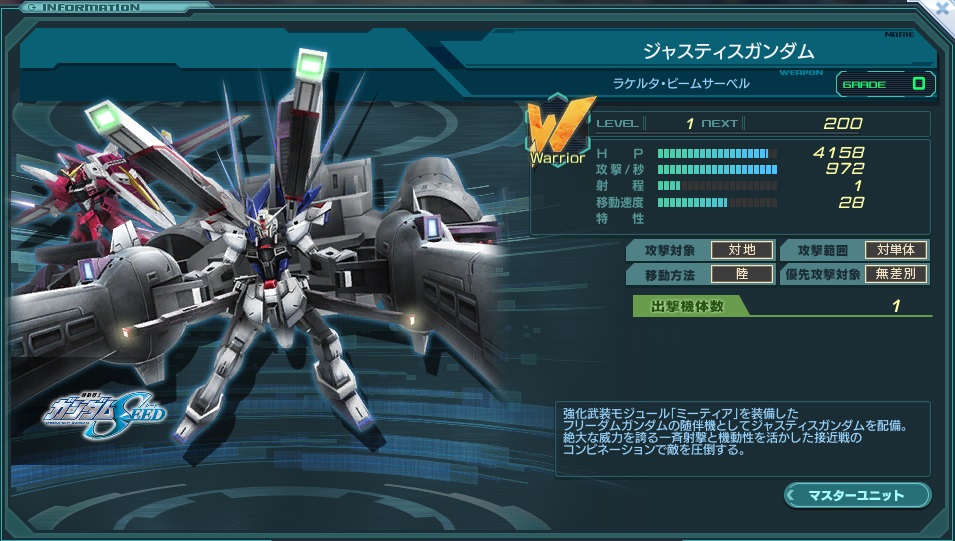 本機のみのものとジャスティスガンダムがトルーパーとしてついているものの2種類が存在し、トルーパー付き版はランキング報酬でしか入手できない。