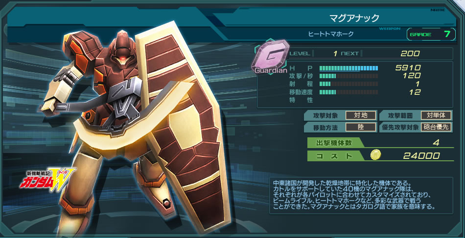 型式番号 WMS-03 中東諸国が対OZに独自開発した局地戦用MS。「マグアナック」とはタガログ語で「家族」を意味する。 かつてガンダムサンドロックのパイロット、カトル・ラバーバ・ウィナーに命を救われた恩により、カトルを「カトル様」と呼んで慕う40人のマグアナック隊が搭乗した。 本編の数年前に地球での再会を約束し、連合・OZと戦うカトルの下に馳せ参じた。 機体性能はリーオーと同程度かちょっと良い程度だがパイロットの熟練度とチームワークにより敵部隊を圧倒する。 ベース機は同一であるが、全機が各パイロットによるカスタマイズが加えられているため1機として同一の機体は存在しない。(さすがにジオフロ内では再現されてはいない)