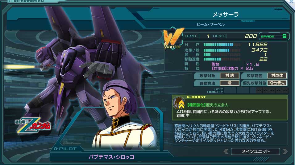 | HPの最大値、攻撃力、移動速度50%、 Gバーストゲージの上昇速度が30%アップする。 | |||