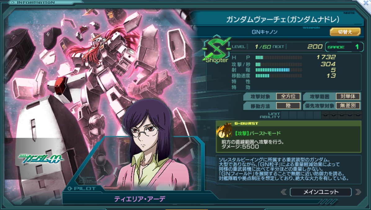 基本的な性能は単体版ヴァーチェに準拠しているが、単体版よりGバーストの火力が下がり、射程が5になっている。