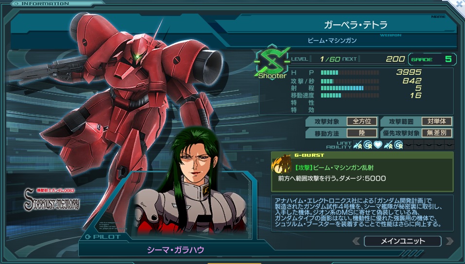 一覧 量産機 | エース | MA 最終ステータス 量産機 | エース | MA 比較データ エースGバースト | シリーズ別早見表 | 特性早見表| MS索引 赤字はレベルアップによるMAX値 基本ステータス