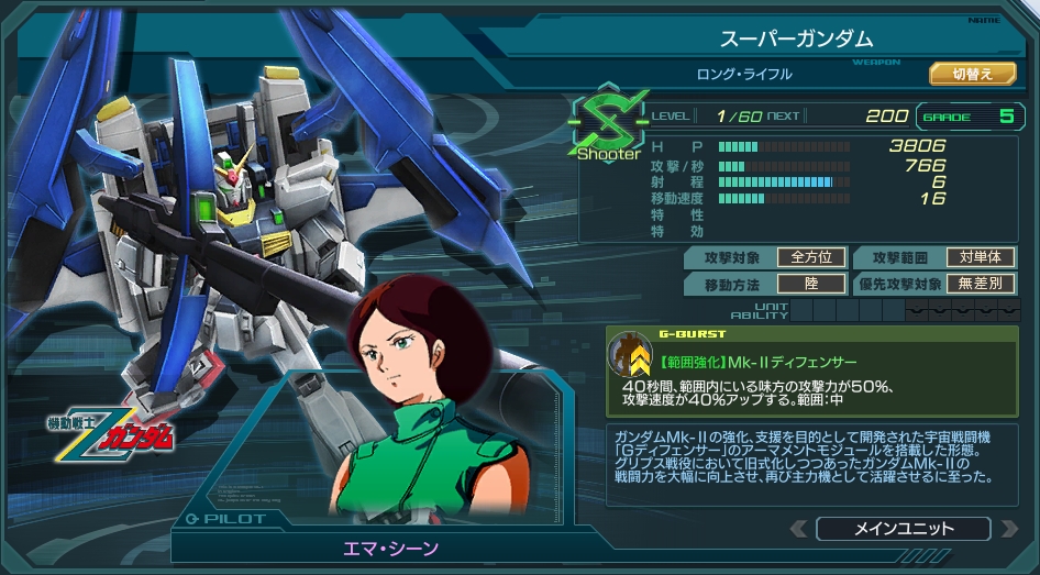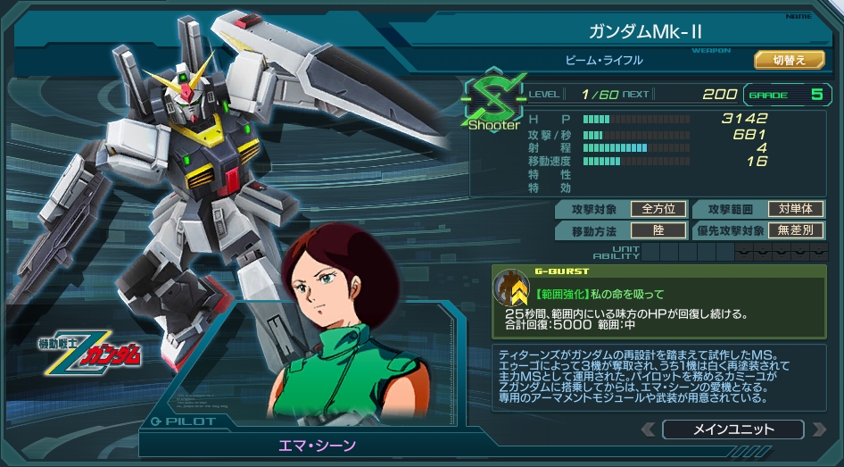 射程6のShooter型エース機。射程6S型で範囲強化Gバースト持ちとガンダムEz8に似ているが、攻撃間隔は1.5秒なのでこの点はむしろVダッシュガンダムに近い。