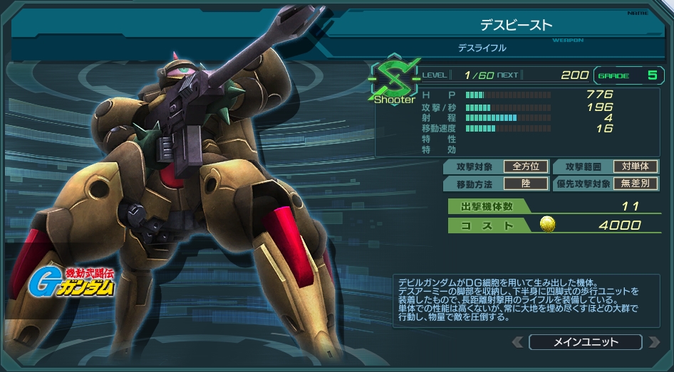 ただし、機体数増加は遅め。入念なレベリングが必要。スペック的にはザクⅡをHP寄りにしたような機体。