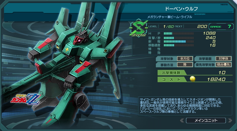 移動速度も16と平均的で遅くはないため、総じて使いやすい量産機と言えるだろう。