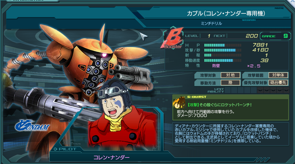 一覧 量産機 | エース | MA 最終ステータス 量産機 | エース | MA 比較データ エースGバースト | シリーズ別早見表 | 特性早見表| MS索引 赤字はレベルアップによるMAX値
