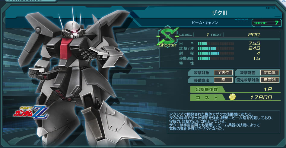 開発Lv3の中では最速入手可能なS型量産機。 ジェガンと比較すると性能が高くなっているだけでなく、初期機体数もプラス1されている。 リゼルC型(ゼネラル・レビル配備機)(ログインボーナス機体)と比べると機体性能では勝るが、機体数で劣るため総合力はほぼ同等。 開発資金とレアチップ消費の少なさ、ツリー下のズサもLv7で開発可能と安定した量産戦力を確保できるツリー配置面でも優秀。