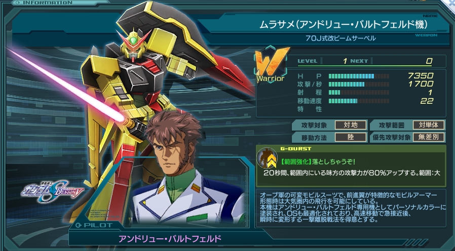 同じく範囲強化持ちWのエールストライクルージュと比べると、機体性能が高いだけでなく攻撃間隔が短くなっており、単体での戦闘力がかなり高くなっている。