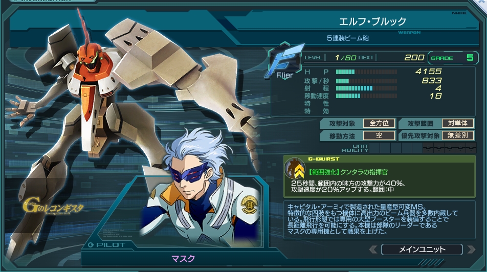 | Gバーストゲージ100%以後、Gバースト終了まで、 射程半減、エース、MA、防壁に対して攻撃力が150%アップ | |||