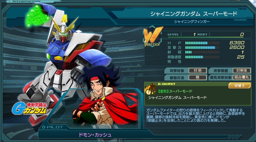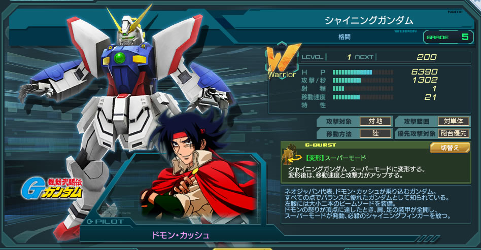 高いHPと高火力を併せ持つ、優先攻撃対象が砲台のウォーリアータイプ。 砲台へのダメージアップなどの特性は無いものの、通常攻撃が1発500ダメージ前後のラッシュ5回+左ストレート1回の計6回攻撃で、 2500ダメージ以上という凄まじい火力を叩き出す。ラッシュ後の隙が非常に短く、すぐに次の6連撃が発生する。 2秒間隔の6回攻撃なので、実際のダメージはステ表記の0.333倍が発生。 HPが高く砲台を優先して狙うため、敵陣のど真ん中に出現しやすい救援エースとしての適正も高い。 Gバーストのスーパーモードは発動させてしまえば永続であり、攻撃方法が1.5秒間隔の1回攻撃「シャイニングフィンガー」に変化する。 スーパーモードは攻撃力2倍になるため実際のダメージはステ表記の3倍が発生。 弱点がないように見えるが、Gバーストが溜まるまでの時間が長く、砲台優先のためラボ等でゲージ稼ぎも狙えない。 発動時間も長く、変身の演出で約5秒程度棒立ち状態となる。(発動モーションは無敵なので喰らいはしないがその間の硬直は無駄な時間) 当然だが飛行型のMSやMAにも手が出せない。 長く生きれば生きるほど大きな戦果を叩き出すので、回復支援(ドモンのためだけにリペアを使ってもいいレベル)や味方ユニットを弾除けとして護衛に置くのが効果的。 幸い移動速度は並みレベルなのでB型エースほど護衛は難しくない。