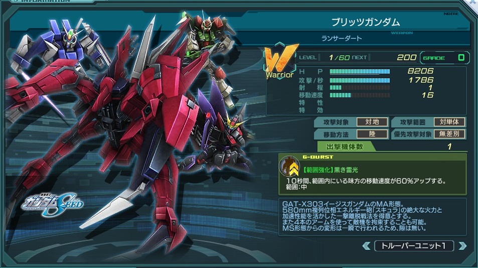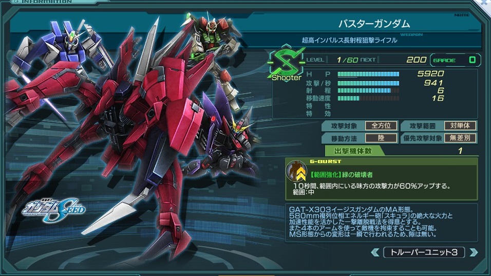 ただし、ブリッツのGバの効果で移動速度が上がるのと、バスターが射程6ゆえブリッツのGバ範囲外になるため、バスターは独立しがち。