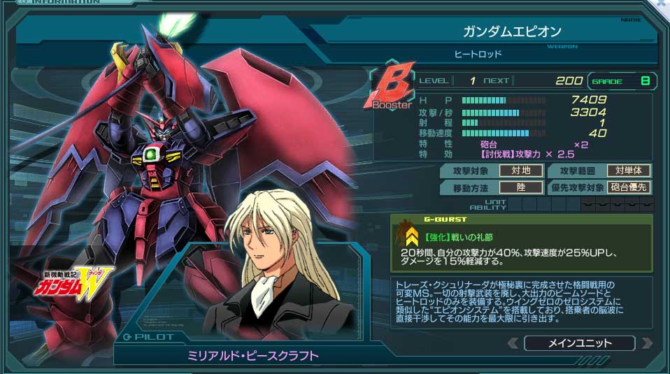 | HPの最大値が60%アップ、Gバーストの効果時間が 100%延長し、受けるダメージを30%軽減する。 | |||