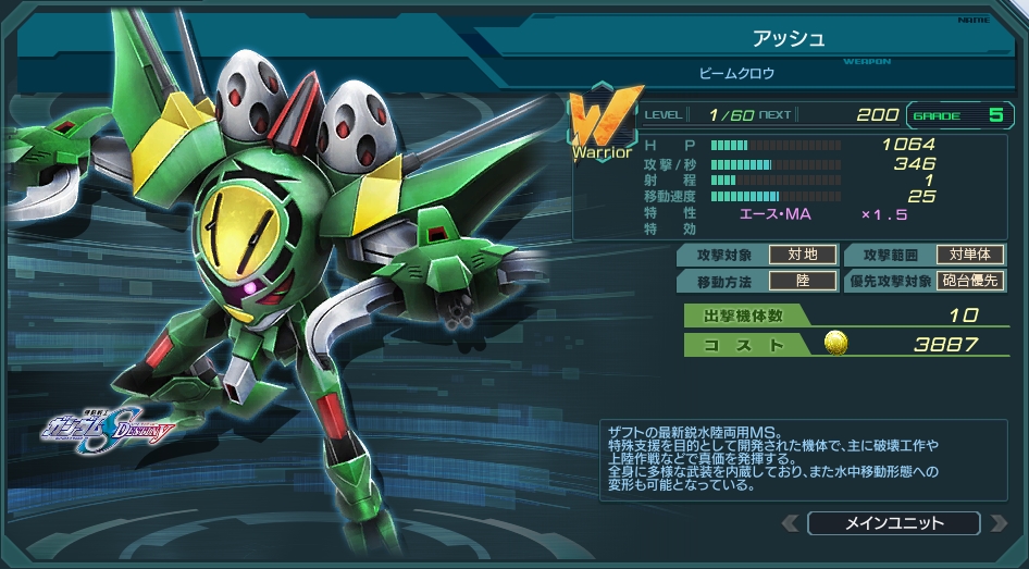 一覧 量産機 | エース | MA 最終ステータス 量産機 | エース | MA 比較データ エースGバースト | シリーズ別早見表 | 特性早見表| MS索引 赤字はレベルアップによるMAX値 基本ステータス