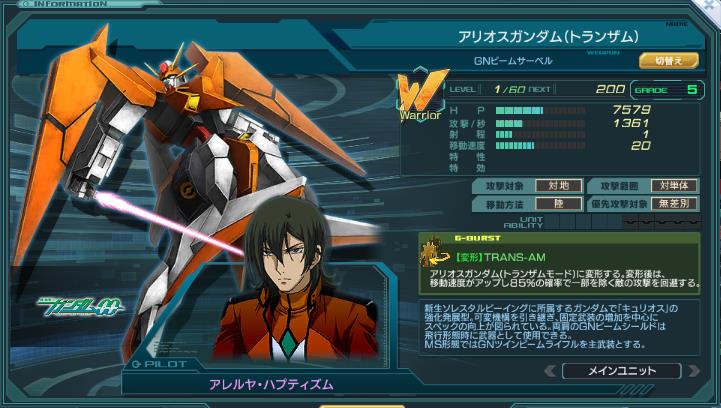 | アリオスガンダム(トランザムモード)に変形する。 変形後は、移動速度がアップし回避(一部除く)85%を得る。 | |||