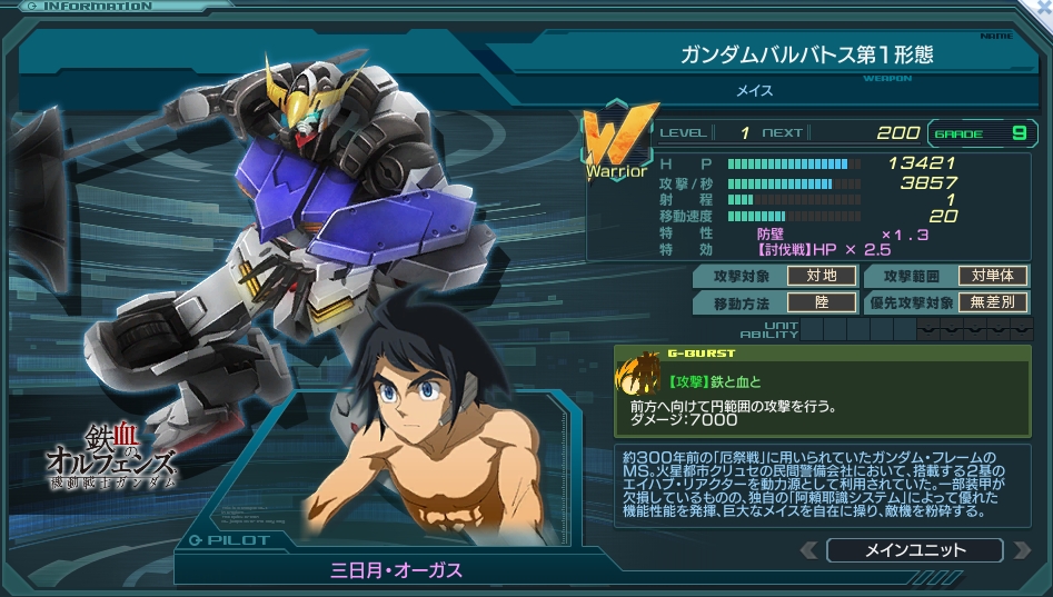 鉄血枠初となるエース機。Warrior型エースで攻撃Gバ持ち。