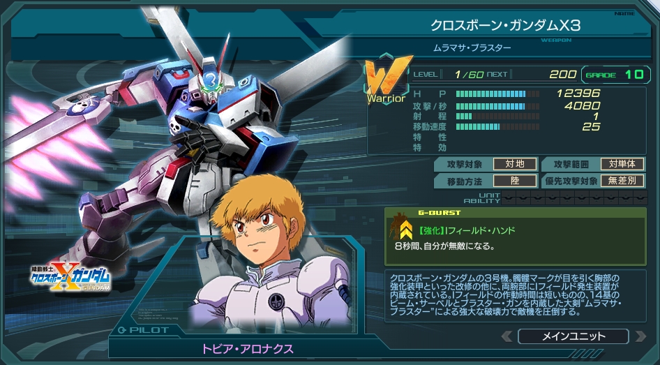 | バトル開始からGバースト使用可能。HPの最大値が50%、 移動速度、攻撃速度が100%アップする。 | |||