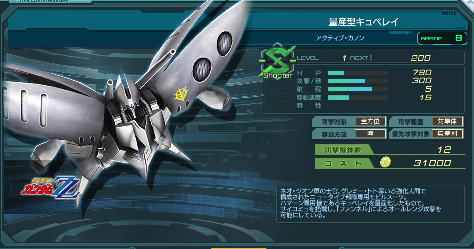 攻撃間隔1秒・射程5のS型では同グレード内最高のDPSを発揮でき、本機を超える火力を持つ機体はガンキャノンなど攻撃間隔1.5秒以上のものになる。