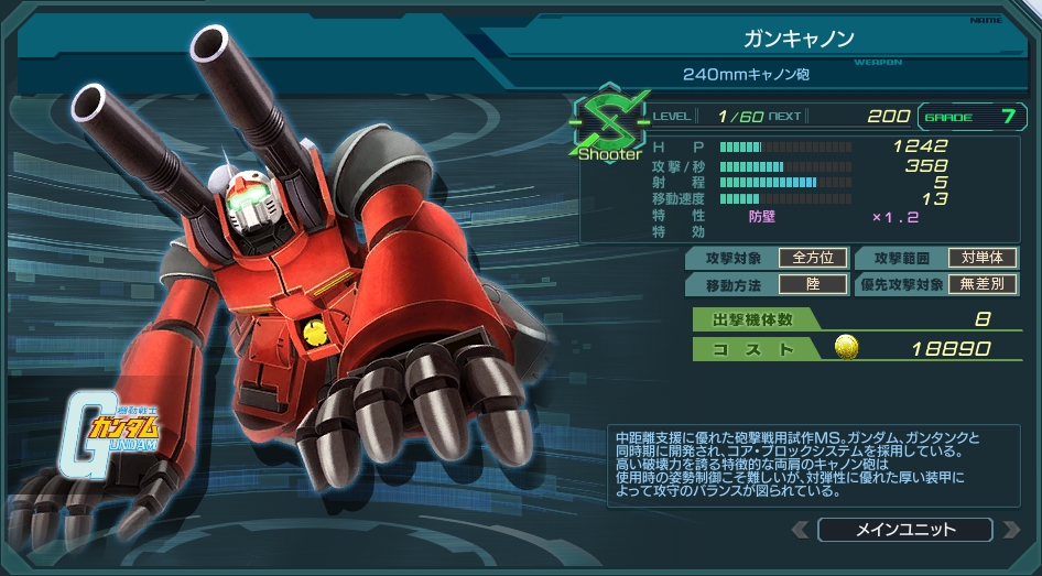 後に同じ攻撃間隔・射程・無差別・S型でガンキャノン最初期型も実装された。