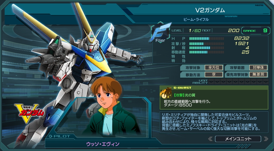 専用Gバーストでは射程6にエース特性、軽減持ちの強力なV2アサルトバスターガンダムへと変形する。