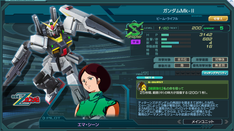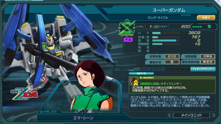 射程6のShooter型エース機。射程6S型で範囲強化Gバースト持ちとガンダムEz8に似ているが、攻撃間隔は1.5秒なのでこの点はむしろVダッシュガンダムに近い。