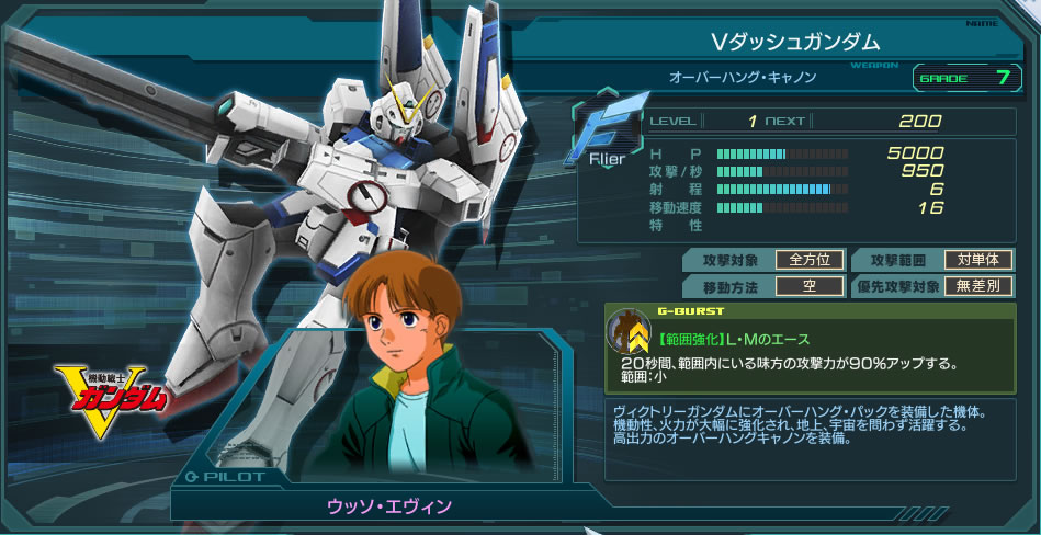 しかし射程が6と大幅延長され、攻撃間隔1.5秒に移動力大幅減少と運用面はVガンダムとほぼ別モノになっている。