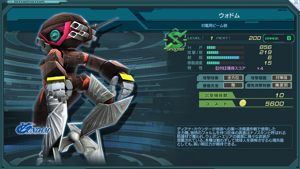 その巨体を反映してか、HPもDPSもS型量産機中トップ(盾役のはずのジム(ランドセル装備)より硬い)とステータスも規格外。