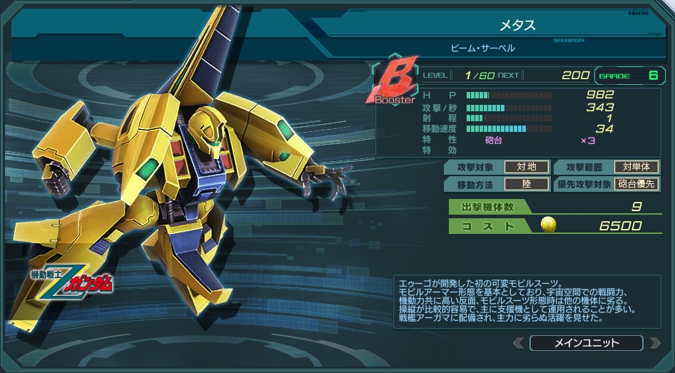 速度34はB型量産機の中では最低値。他機種をサポーターで速度増強してやれば、足並みを揃えやすくなるかもしれない。