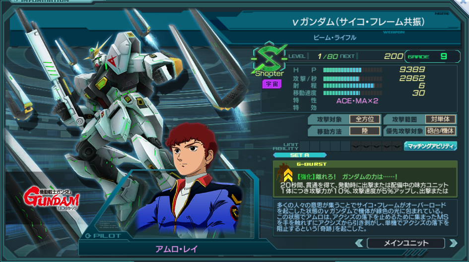 一覧 量産機 | エース | MA 最終ステータス 量産機 | エース | MA 比較データ エースGバースト | シリーズ別早見表 | 特性早見表| MS索引 赤字はレベルアップによるMAX値 基本ステータス