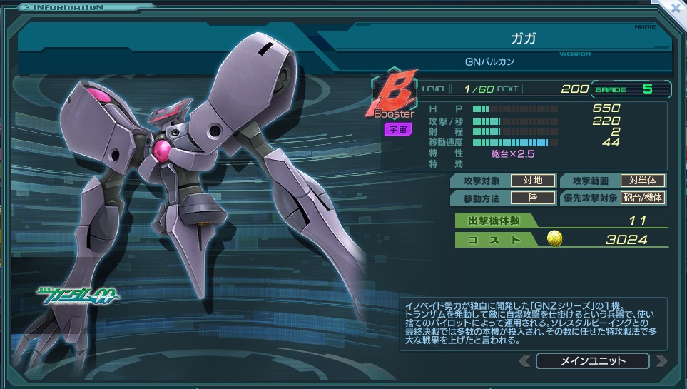 一覧 量産機 | エース | MA 最終ステータス 量産機 | エース | MA 比較データ エースGバースト | シリーズ別早見表 | 特性早見表| MS索引 赤字はレベルアップによるMAX値 基本ステータス