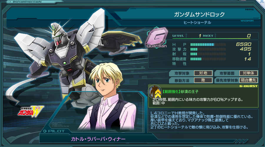 撃破時の修理時間は約5時間5分、バースト使用までの時間は約30秒 開発レベル2の中でも非常にタフネスな砲台優先のガーディアンタイプエース。 またGバーストによる攻撃力上昇もあり、集団で上手く切り込めればかなり強力。 反面、足回り、攻撃テンポが非常に遅いため、個人戦の攻撃性能は,低め。 足回りがGタイプらしく遅いので配置、タイミングを間違えると守るべきユニットがサンドロックの盾になりかねないので少々扱いが慣れないと難しい。 上手く囮にできればハイゴッグと共に頼りになる。 問題は、エースは撃墜されると再出撃時間が発生するので、エース機体で囮役というミスマッチを起こしている。 囮運用ならハイゴッグ等がやられてから出撃、プトレマイオスの回復等などできる限り生存させるといい。 ゲージ技目当てなら、開幕時あえて目標施設から長距離に単独配置し足回りの悪さを逆手にとりゲージ時間を稼ぐなどもあり。 マップ北端から中央までの移動にかかる時間は約20秒 一撃で攻撃力表示の1.5倍のダメージが出る。一回の攻撃間隔は約5秒 砲撃等によって体勢を崩すことがない。