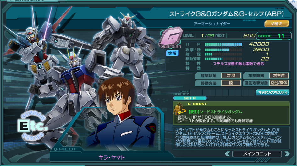 | Guardian | 特性 | 命中50% ダメージ軽減40% ステルス状態の敵も索敵できる Gバーストを使用すると一度だけ45秒間、通常攻撃と攻撃Gバーストからのダメージ上限:1000を得る。 砲台×2 防壁×3.5 ACE×1.2 | ||