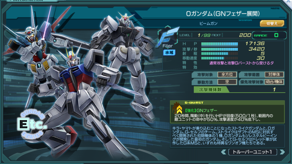 | Flier×1 | 特性 | 回避(一部除く)70% 必中 ダメージ軽減50% 通常攻撃と攻撃Gバーストから受けるダメージ上限:1500 全施設(防壁以外)×2 ACE×1.5 量産機・トルーパー×2 | ||