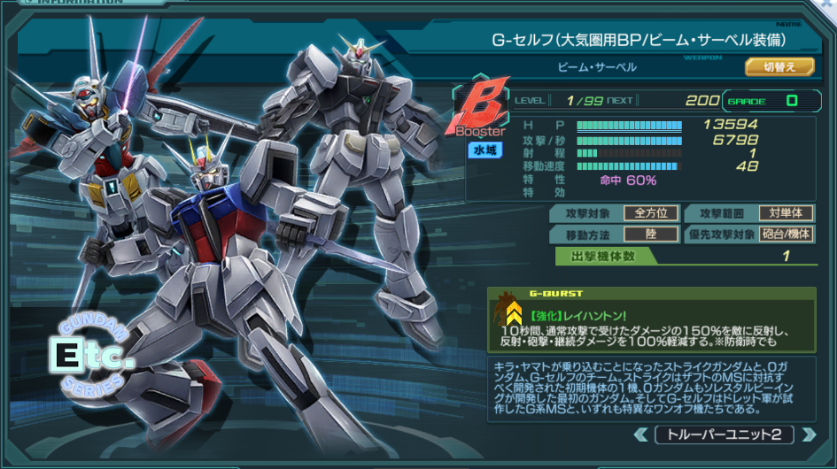 | Booster | 特性 | 回避(一部除く)60% 命中50% ダメージ軽減60% ステルス状態の敵も索敵できる 追加装甲(20000)×1 Gバーストを使用すると一度だけ45秒間、通常攻撃と攻撃Gバーストからのダメージ上限:1000を得る。 砲台×2 ACE×2 | ||