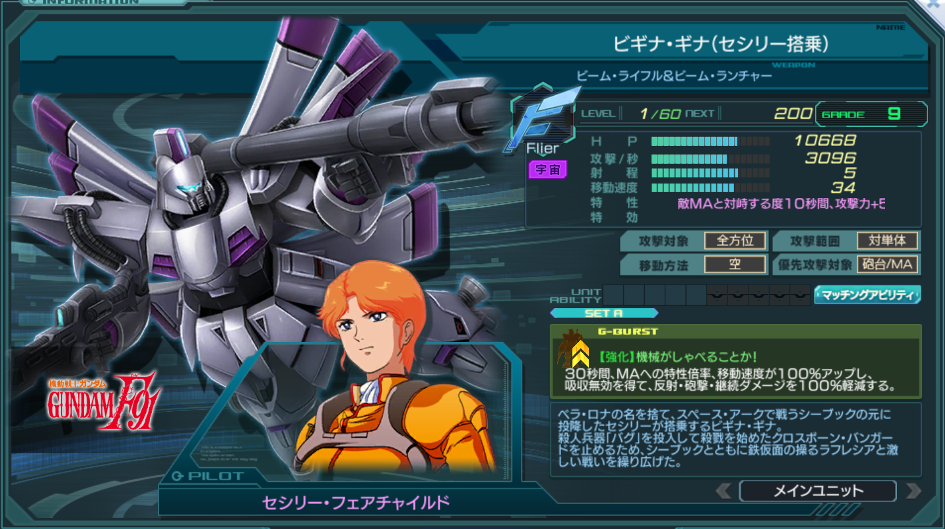 | Flier | 特性 | 回避(一部除く)65% 命中50% 通常攻撃と攻撃Gバーストから受けるダメージ上限:3000 回避成功時、HP回復500 敵MAと対峙する度10秒間、攻撃力+50%※発動毎にリセット 砲台×1.5 MA×2 | ||