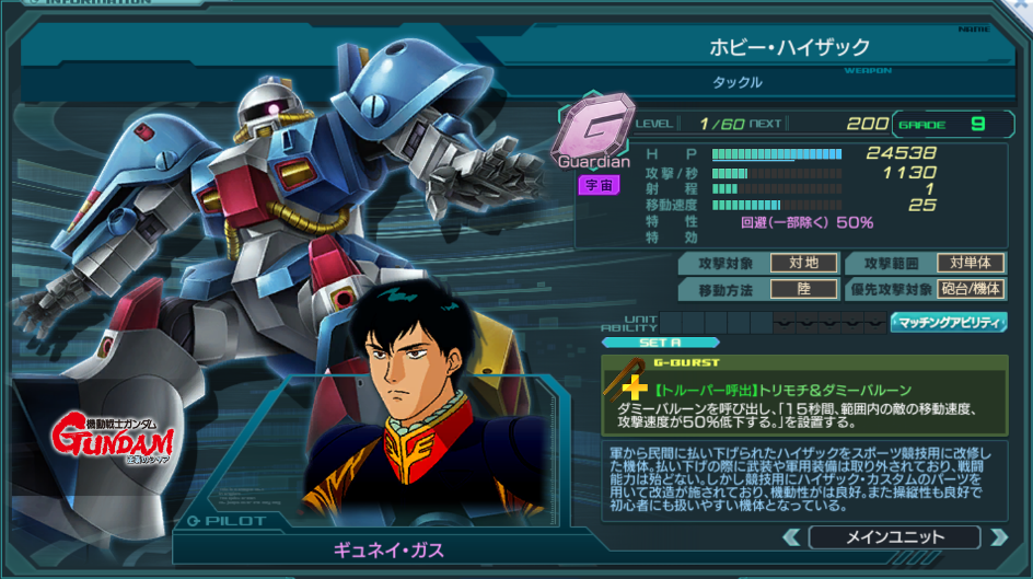 | Guardian | 特性 | 回避(一部除く)50% 回避成功時、3秒間、Gバースト上昇速度+100%※発動毎にリセット | ||